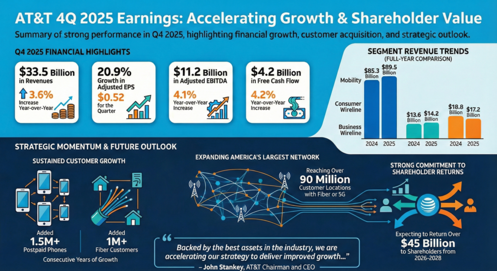 AT&T reported revenue of $33.5 billion for the fourth quarter of 2025, up 3.6% from the prior year, driven by growth in Mobility, Consumer Wireline and Mexico operations. Full-year revenue was $125.6 billion, a 2.7% increase from 2024.