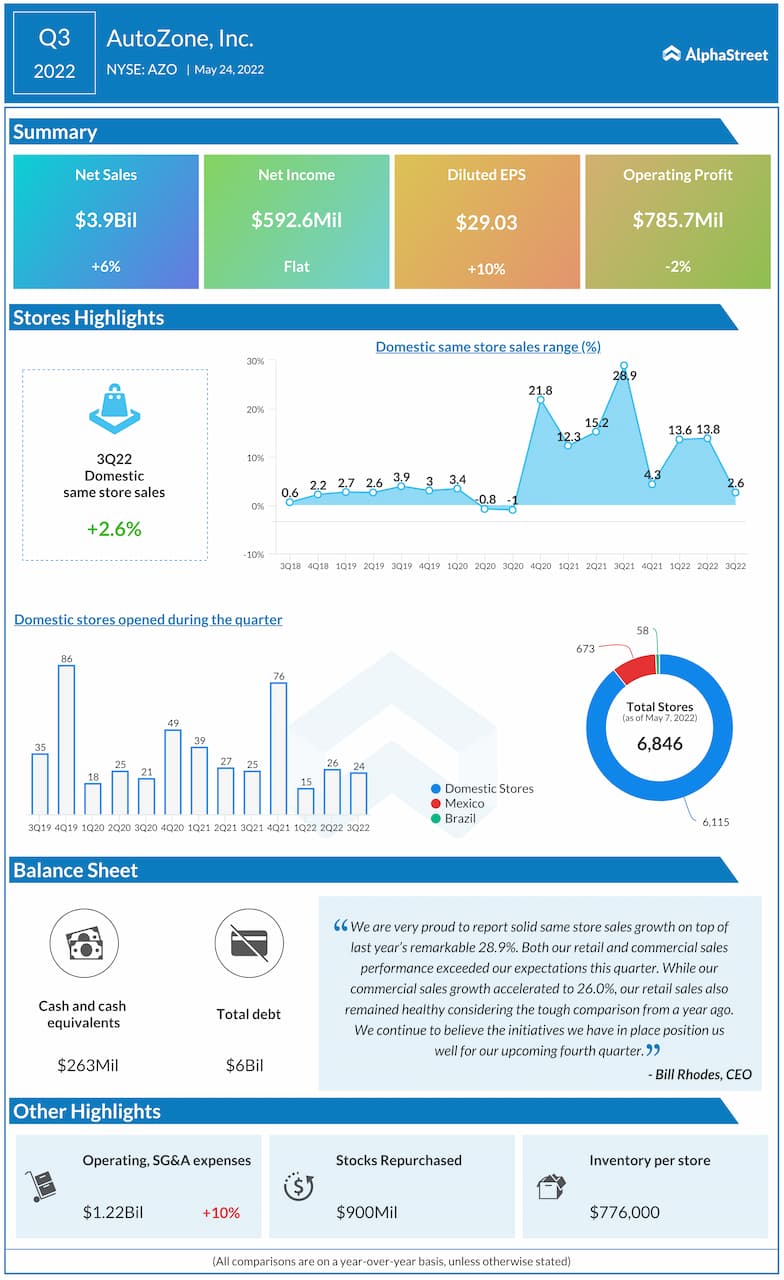 AutoZone, Inc. (NYSE: AZO) reported third quarter 2022 earnings results today.