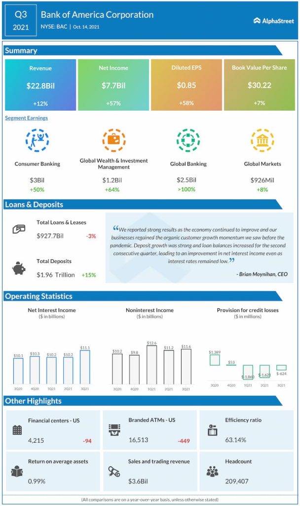 Bank of America Corporation (NYSE: BAC) reported third quarter 2021 earnings results today.
