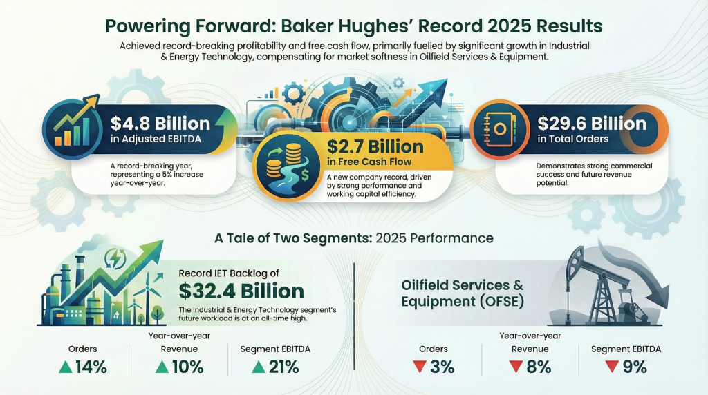 For the full year 2025, Baker Hughes recorded total revenue of $27.7 billion, remaining flat compared to 2024. Full-year orders reached $29.6 billion, driven by record IET orders of $14.9 billion. Attributable net income for the year was $2,588 million.