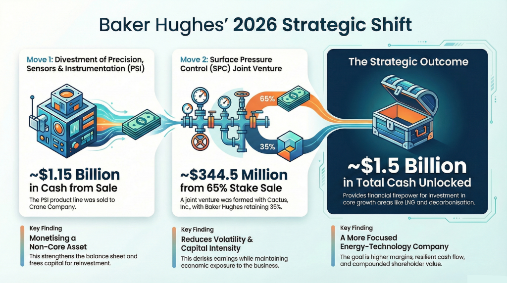 Almost in parallel, Baker Hughes finalized a joint venture (JV) for its surface pressure control (SPC) business with Cactus, Inc., which closed on 2 January 2026. Under the terms of the agreement, Cactus acquired a 65% stake, while Baker Hughes retained 35% and received approximately $344.5 million in cash proceeds.