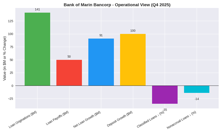 Bank of Marin Bancorp reported quarter-over-quarter growth in loans and deposits and an improvement in net interest margin. Credit metrics improved, and capital ratios remained above regulatory requirements. Shares declined on the day of disclosure as investors evaluated operating performance.