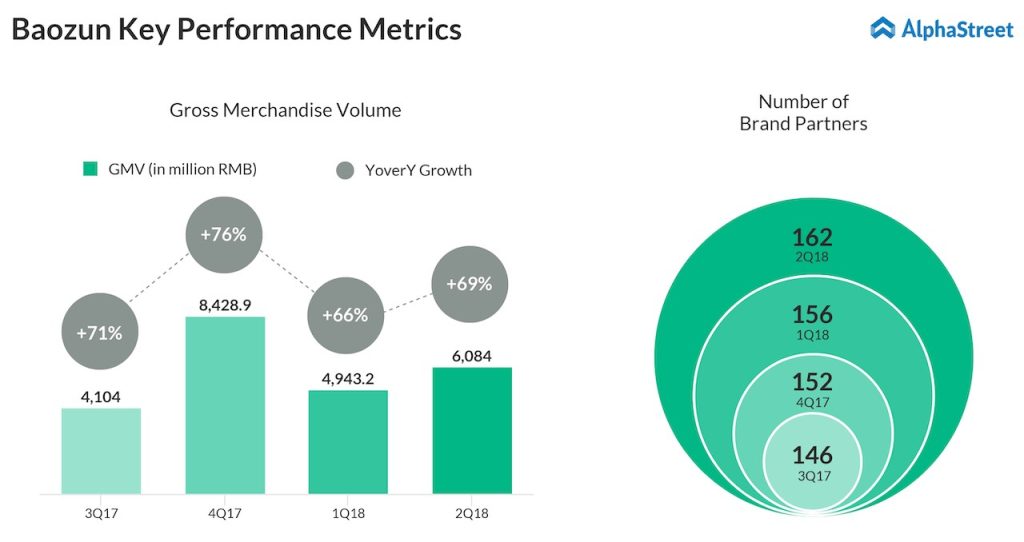 Baozun, which went public on Nasdaq in May 2015, reported its second quarter 2018 results in August 2018. Total gross merchandise volume (GMV) jumped 69% to RMB6.1 million. Revenue increased by 30% to RMB1.16 billion ($175 million) and non-GAAP profit per ADS rose 32% to RMB0.96 ($0.15) compared to the second quarter of 2017. The company guided that GMV will grow to over RMB20 billion during the second half of this year.