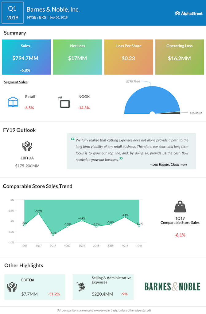 Barnes & Noble Inc. (BKS) missed estimates on revenues and earnings for the first quarter of 2019. The retailer reported total sales of $795 million, down 6.9% from the same period last year. Comparable store sales fell 6.1%.
