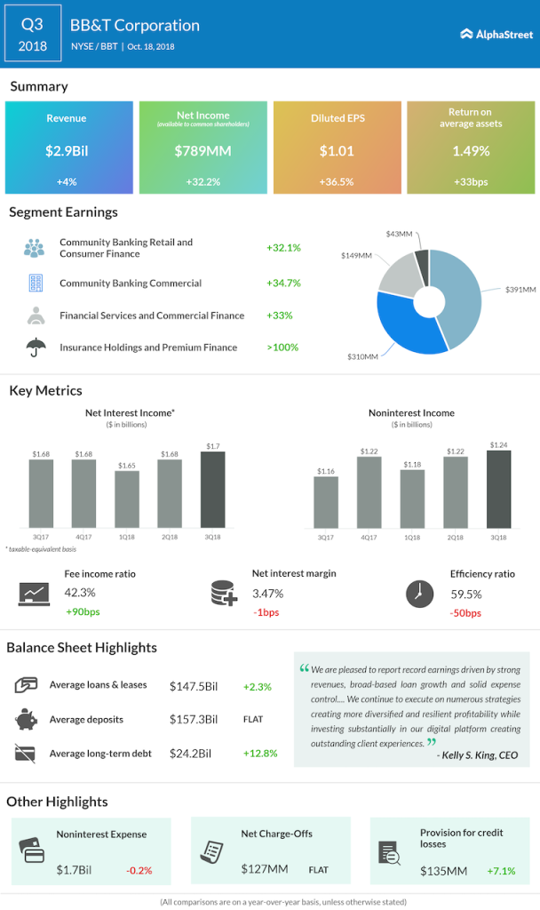 “We are pleased to report record earnings driven by strong revenues, broad-based loan growth and solid expense control,” said CEO Kelly King. He added, “Revenue exceeded $2.9 billion as we achieved records in both net interest income and noninterest income.”