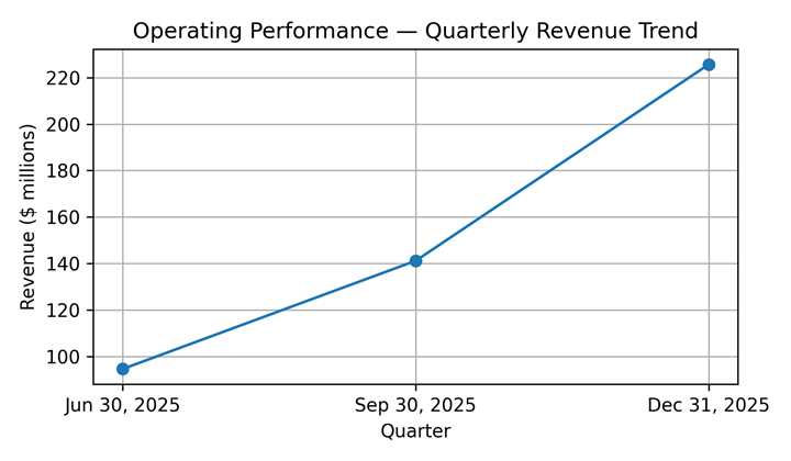 For the quarter ended December 31, 2025, consolidated revenue was $225.659 million and net income was $53.366 million. Revenue rose 146.42% year‑over‑year. Net income rose 204.32% year‑over‑year.