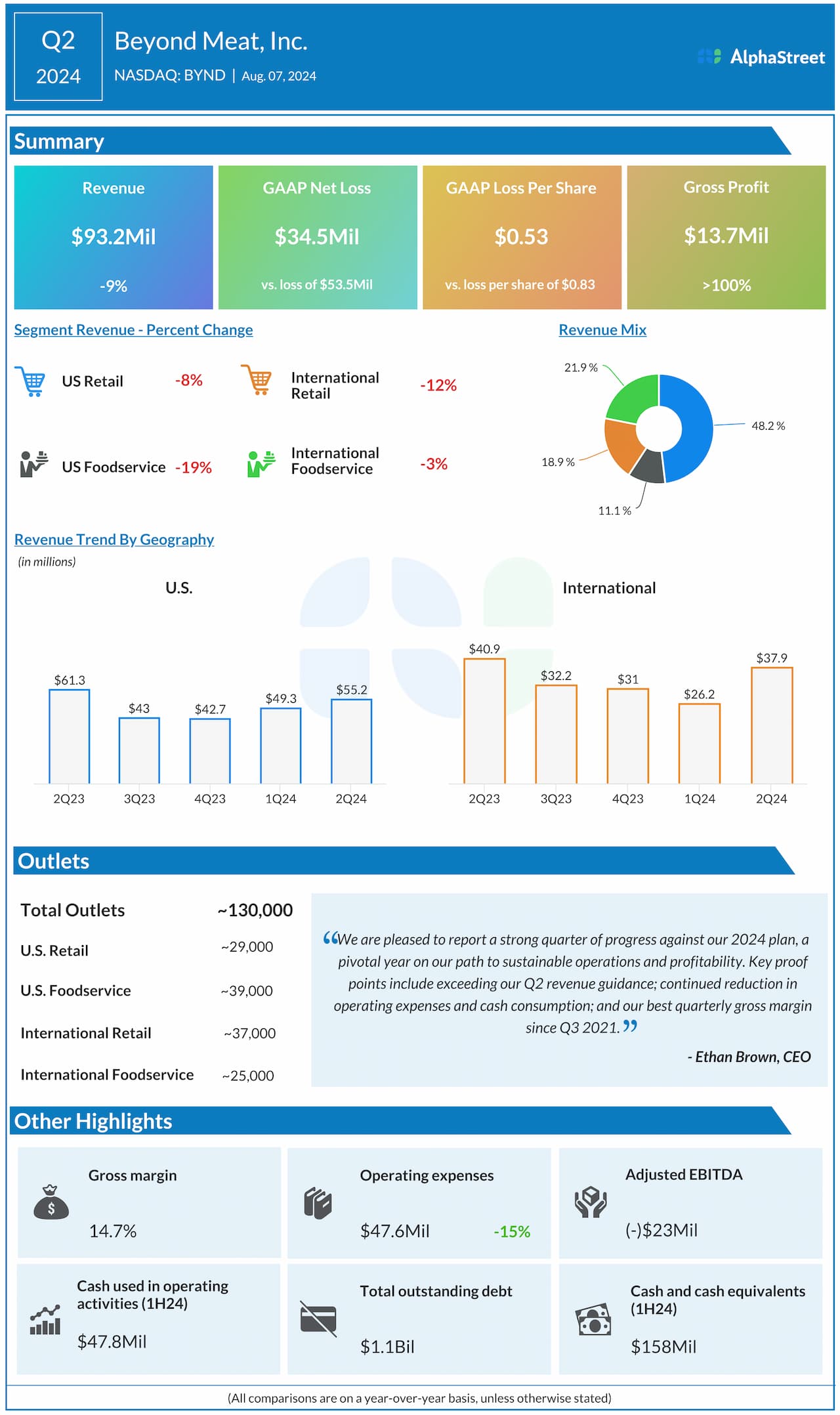Beyond Meat, Inc. (NASDAQ: BYND) reported net revenues of $93.2 million for the second quarter of 2024, down 8.8% year-over-year.