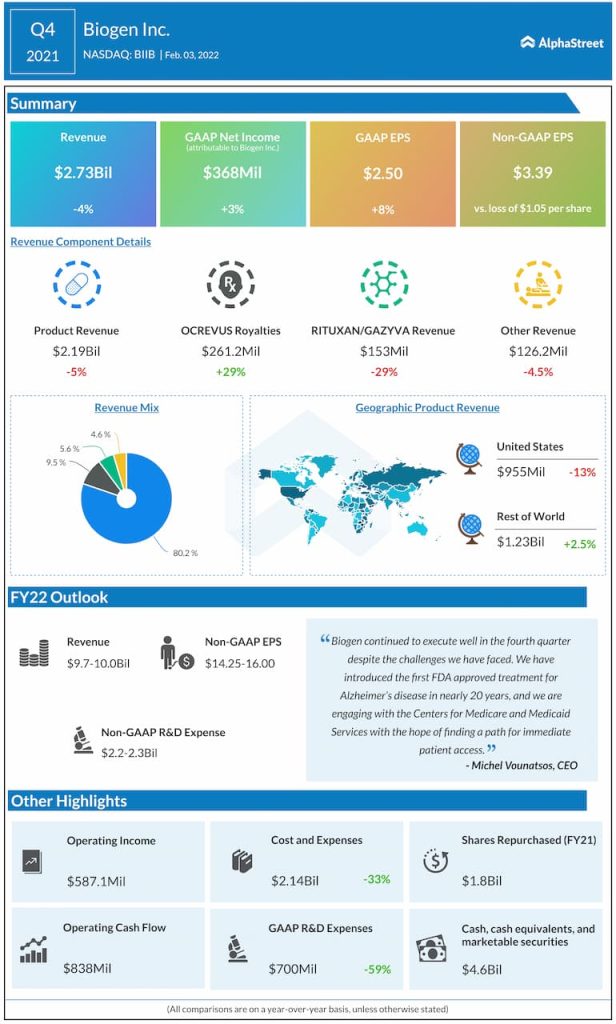 For the full year of 2022, Biogen expects revenue to range between $9.7-10 billion and adjusted EPS to range between $14.25-16.00.