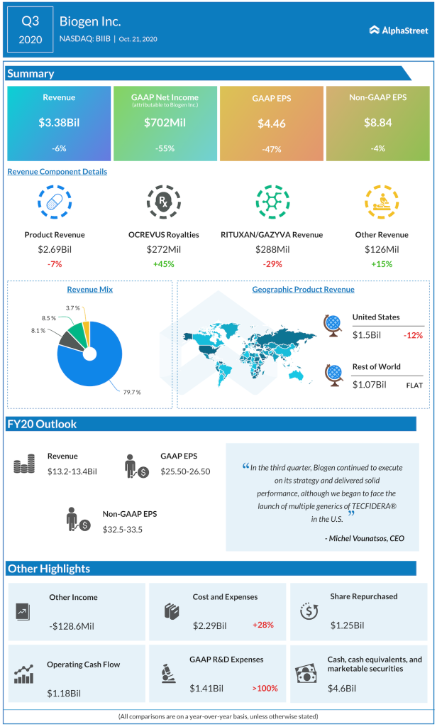 Biogen (NASDAQ: BIIB) reported third-quarter 2020 financial results before the opening bell on Wednesday. The biotechnology giant reported a 6% decline in Q3 revenues to $3.38 billion, beating the Wall Street consensus. Earnings of $8.84 per share were also stronger than what analysts had anticipated.