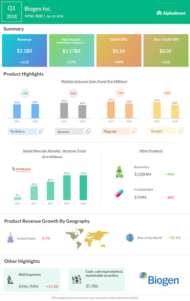 Revenue during the quarter jumped 11% to $3.1 billion, propelled by SPINRAZA (to treat spinal muscular atrophy), which contributed $364 million in global revenues, and biosimilars that contributed $128 million.