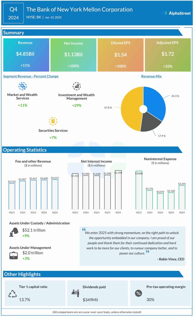 Fourth-quarter revenue was $4.85 billion, up 11% from the year-ago quarter and above analysts’ forecast. Assets under management and assets under custody increased 3% and 9%, respectively, during the three months.