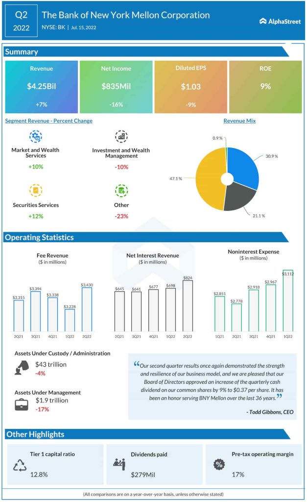 “We continued to see good sales momentum across most of our businesses, and healthy client volumes tempered the impact of lower market values. We deeply appreciate our employees’ commitment in these more volatile markets. Our clients clearly value our resilience, the quality of our services and insights, and the trusted relationship that they have with BNY Mellon,” said the bank’s president Robin Vince.