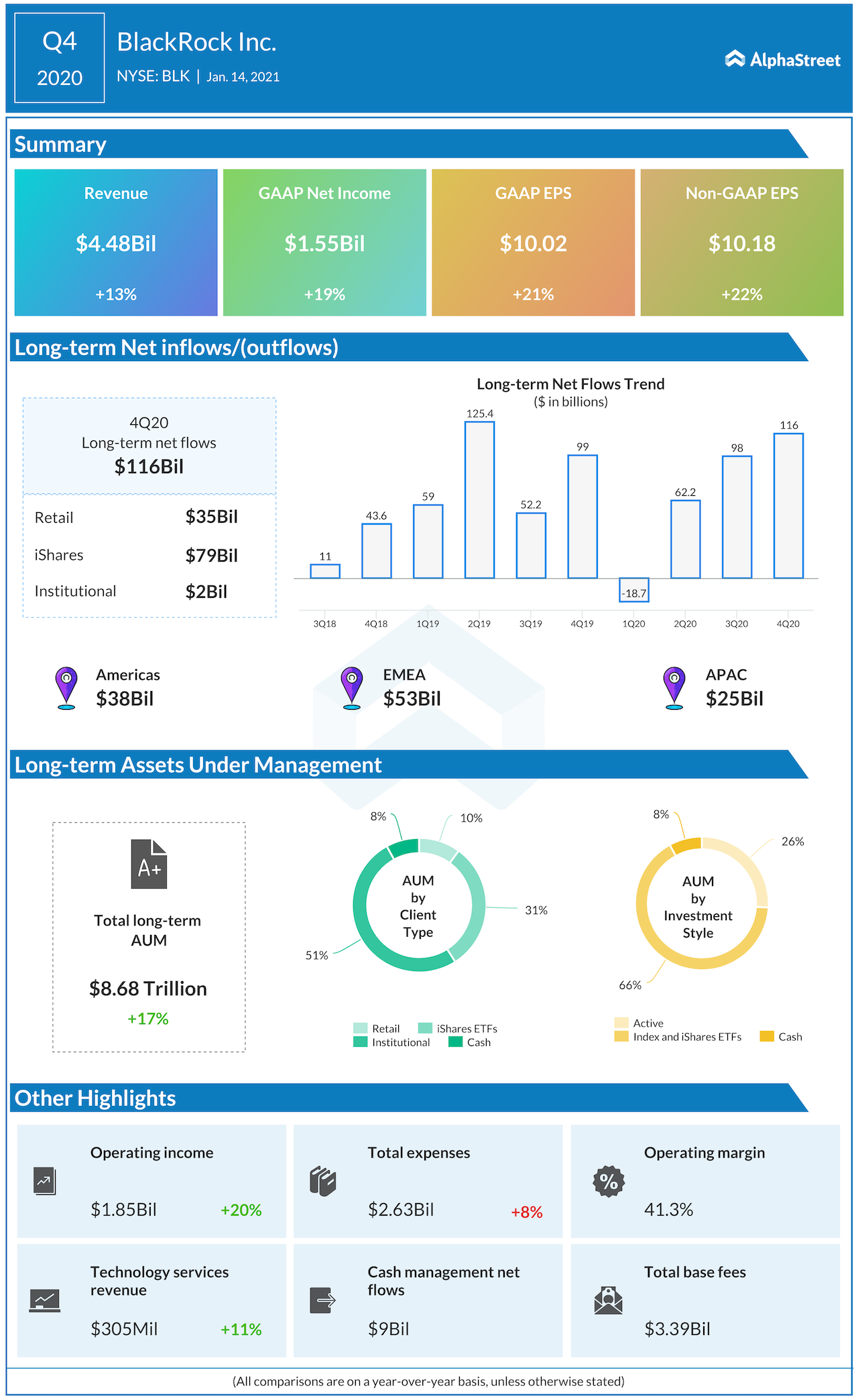 CEO Laurence D. Fink, said, “Our strategic areas of investment flourished in 2020 as we saw record client demand for active equity, sustainable, cash and alternative investment strategies, generated $185 billion of net inflows into iShares ETFs and surpassed $1 billion in technology services revenue.”