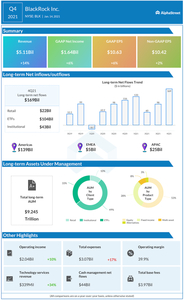 Blackrock Inc (NYSE: BLK) reported fourth-quarter 2021 financial results before the regular market hours on Friday. The investment management firm reported Q4 revenue of $5.11 million, up 14% year-over-year, but lower than the Wall Street projection. Net income of $10.63 per share was, meanwhile, well above the target that analysts had anticipated.