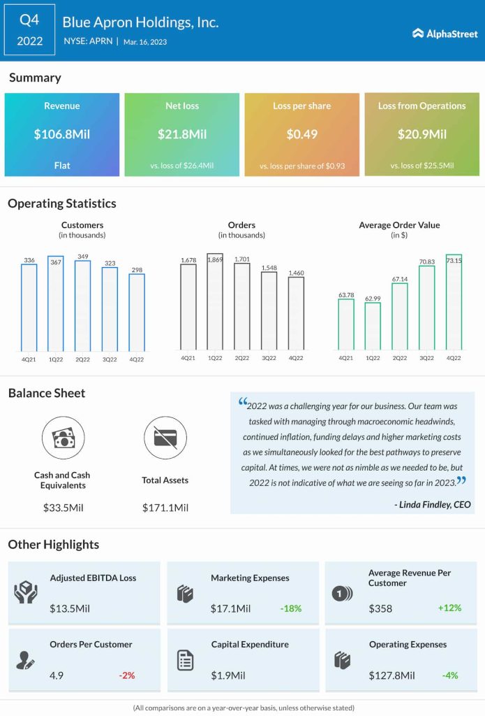 Blue Apron Holdings, Inc. (NYSE: APRN) has reported a narrower net loss for the fourth quarter of 2022 when the company’s revenues remained unchanged.