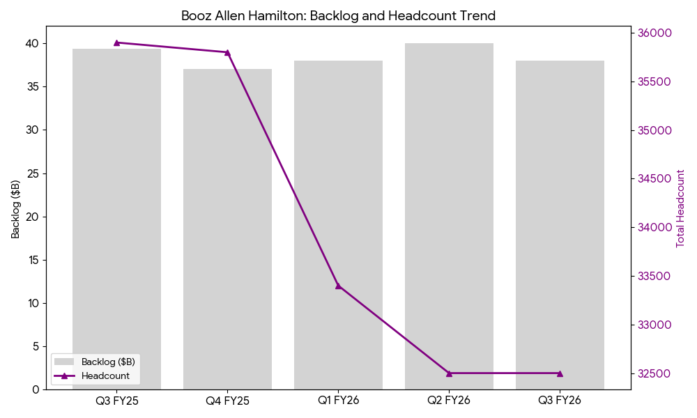 Quarterly revenue declined from Q3 fiscal 2025 levels of ~$2.92 billion. Backlog remained solid, though slower bookings signal potential top-line pressure in upcoming quarters. Headcount stability suggests tight control over labor costs and productivity during a period of weaker revenue growth.