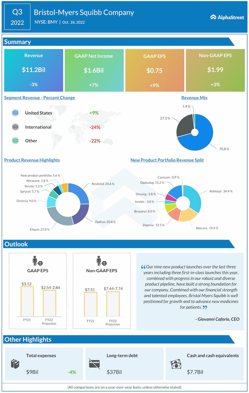 Bristol Myers Squibb (NYSE: BMY) reported revenues of $11.2 billion for the third quarter of 2022, down 3% from the same period a year ago.