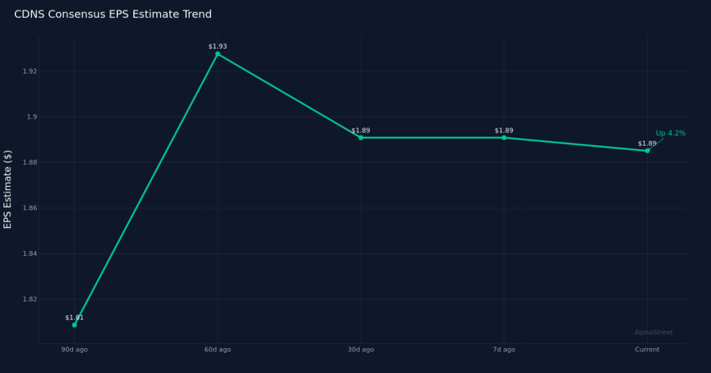 Strong Year-Over-Year Growth Projected. The current consensus points to robust year-over-year expansion, with expected EPS of $1.89 representing a +20.4% increase over the year-ago result of $1.57. Revenue estimates similarly reflect healthy momentum, with the $1.46B target marking a +17.7% gain from the $1.24B reported in Q1 2025. Last year’s first quarter delivered net income of $430.4M on a net margin of 34.7%, providing a profitability benchmark against which investors will measure this year’s performance. The double-digit growth rates on both the top and bottom lines suggest Cadence continues to benefit from sustained investment in chip design tools and system analysis software, though the relationship between revenue growth and margin trajectory will be a key focus as the company scales.