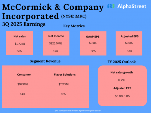 Adjusted earnings dropped 13% year-over-year to $0.77 per share in the October quarter, but exceeded estimates. Net earnings attributable to the company were $194 million or $0.65 per share in Q1, compared to $218 million or $0.73 per share last year.