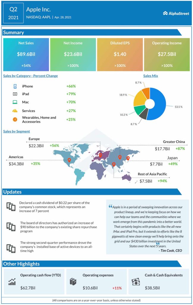 When markets fell into the grip of coronavirus early last year, Apple’s revenues suffered as iPhone sales faltered, extending the slowdown experienced in the trailing quarters. Though challenges like the severe chip shortage persisted, things changed for the better in the early months of fiscal 2021 when sales bounced back and stayed in the positive territory. Underscoring the company’s strong financial position, the management has announced an additional $90 billion of stock buyback and a 7% dividend hike.
