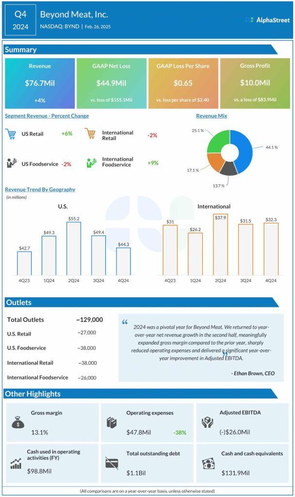 For the full year of 2025, Beyond Meat expects net revenues to range between $320-335 million. Revenues for the first quarter of 2025 are expected to be comparable to the prior-year period. Gross margin for the full year is expected to be approx. 20% while operating expenses are expected to range between $160-180 million.
