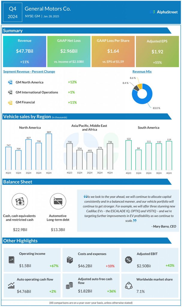 In the final three months of FY24, revenue increased across all three operating segments. There was 12% revenue growth in the core North America division, reflecting a year-over-year increase in vehicle sales. At $47.7 billion, total revenue was up 11%. Adjusted earnings, excluding special items, jumped 55% annually to $1.92 per share in Q4. On a reported basis, it was a net loss of $2.96 billion or $1.64 per share in the December quarter, compared to a profit of $2.10 billion or $1.59 per share last year. Quarterly sales and profit consistently beat estimates for more than three years.