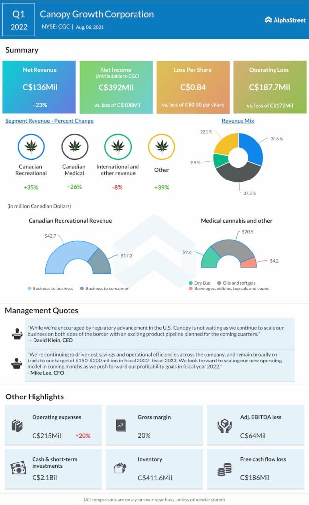 Net income attributable to Canopy Growth Corporation amounted to CAD392.4 million, or CAD0.84 per share. This compares to a loss of CAD108.5 million, or CAD0.30 per share, last year.
