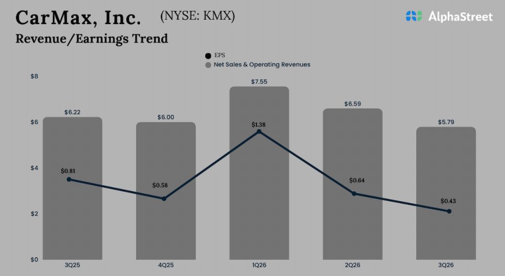 Net sales and operating revenues decreased to $5.79 billion in the third quarter from $6.22 billion in the comparable quarter of FY25. The top line came in above expectations. During the quarter, retail used unit sales and comparable store used unit sales declined by 8% and 9% respectively. Wholesale units dropped 6.2%.