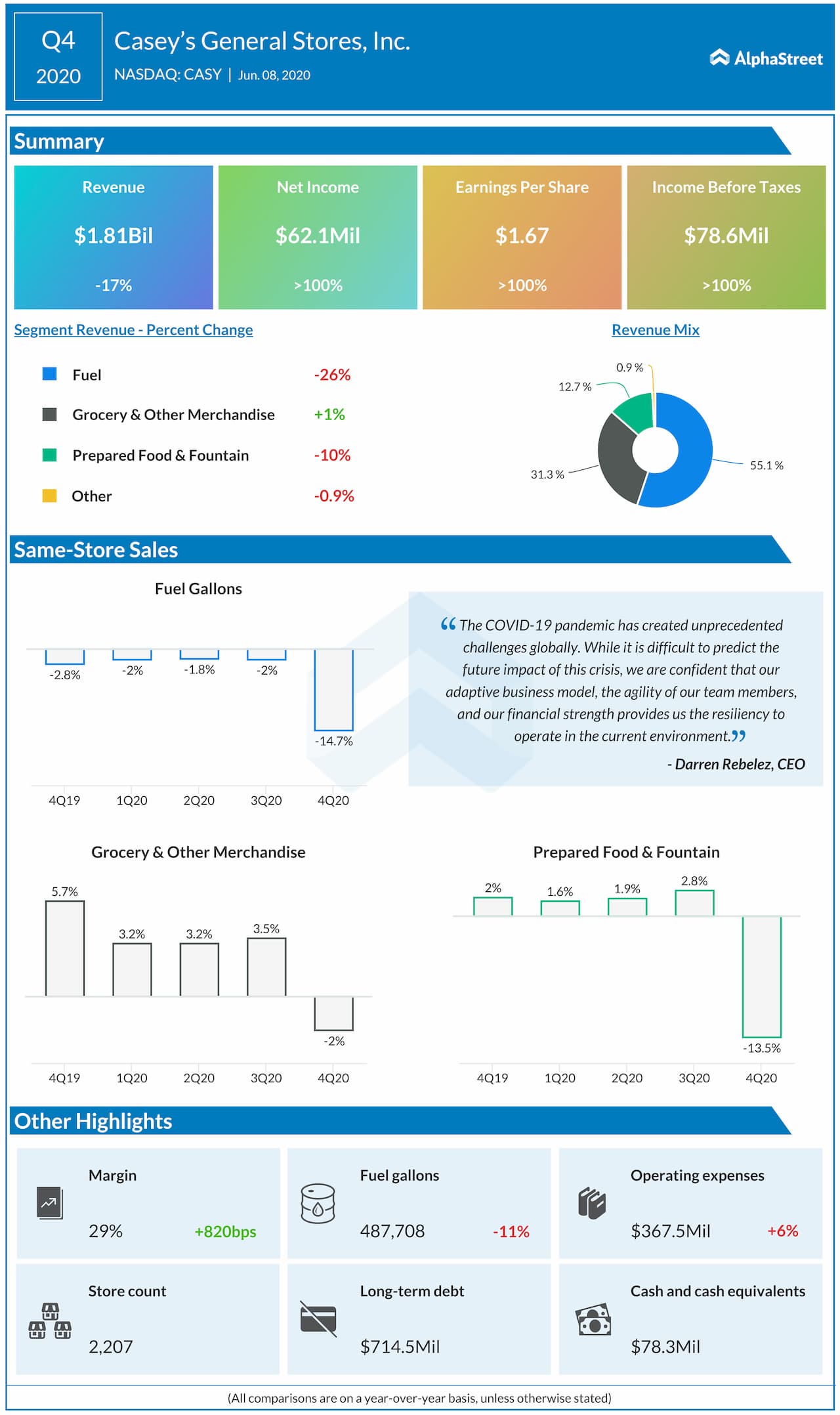 Casey’s General Stores Inc. (NASDAQ: CASY) reported its financial results for the quarter ended April 30, 2020, on June 8, Monday after the market closes. The results were impacted by the unprecedented challenges created by the COVID-19 pandemic crisis.