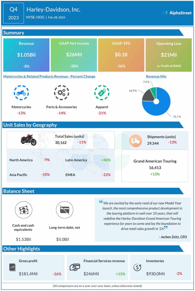 Motorcycle manufacturer Harley-Davidson (NYSE: HOG) on Thursday reported a sharp decline in sales and net profit for the...
