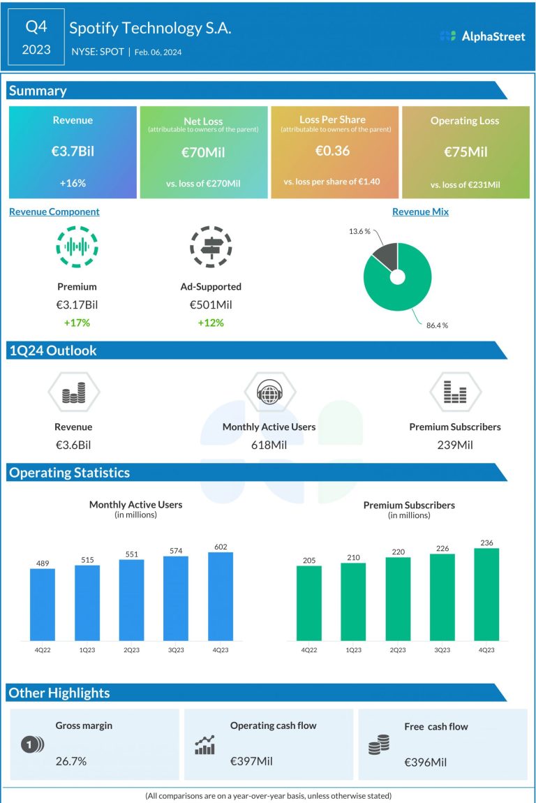 Spotify Technology SA (NYSE: SPOT) reported its fourth quarter 2023 earnings results today. Total revenue grew 16% year-over-year...
