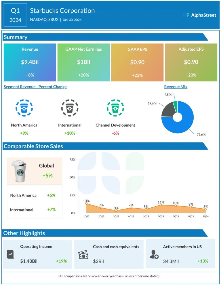 Starbucks Corporation (NASDAQ: SBUX) reported first quarter 2024 earnings results today. Consolidated net revenues increased 8% year-over-year to...
