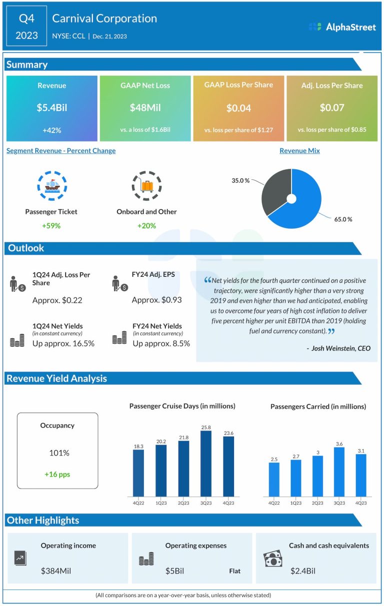 Carnival Corporation & plc (NYSE: CCL) reported fourth quarter 2023 earnings results today. Revenues increased to $5.4 billion from $3.8...