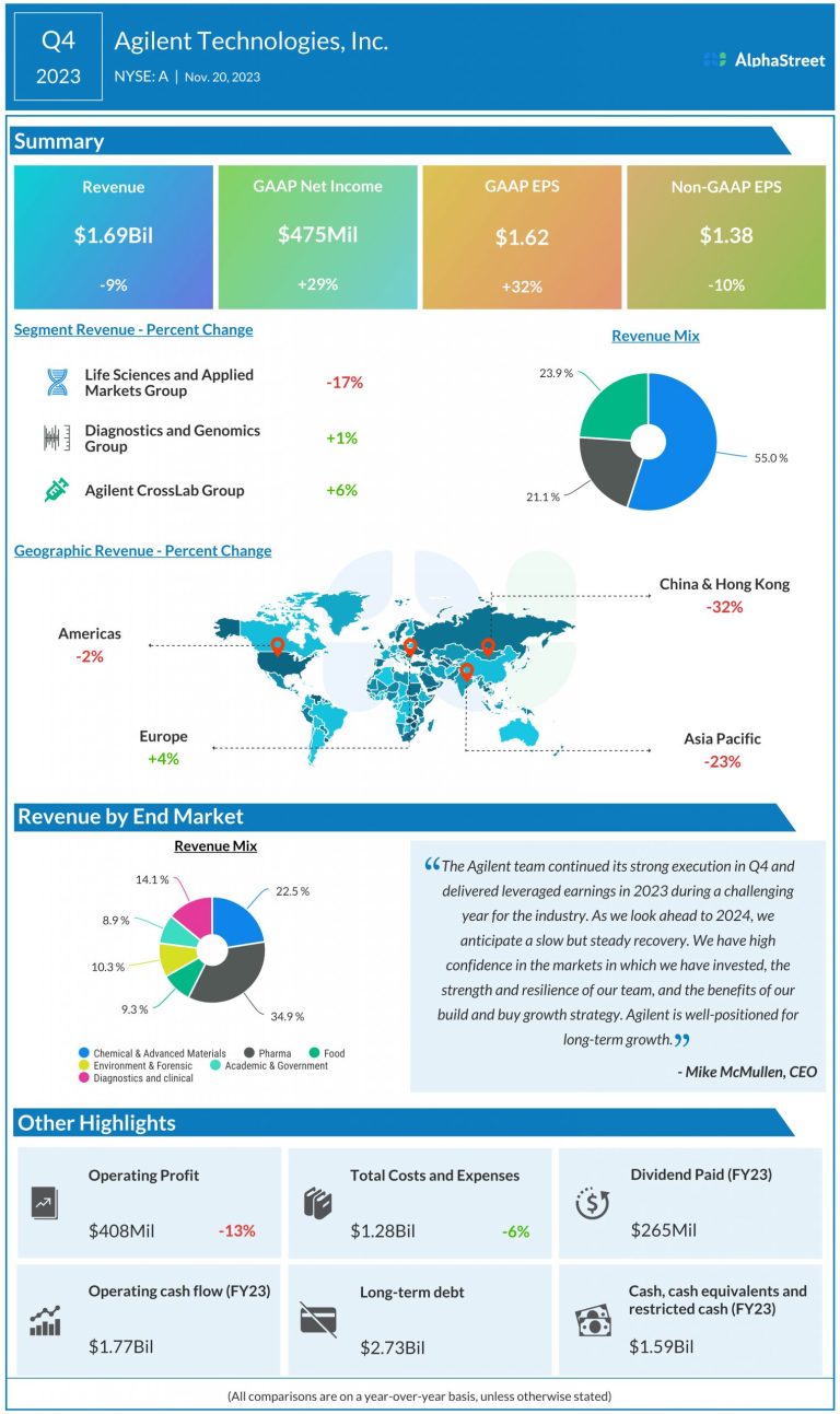 Agilent Technologies Inc. (NYSE: A) reported revenue of $1.69 billion for the fourth quarter of 2023, down 8.7%...