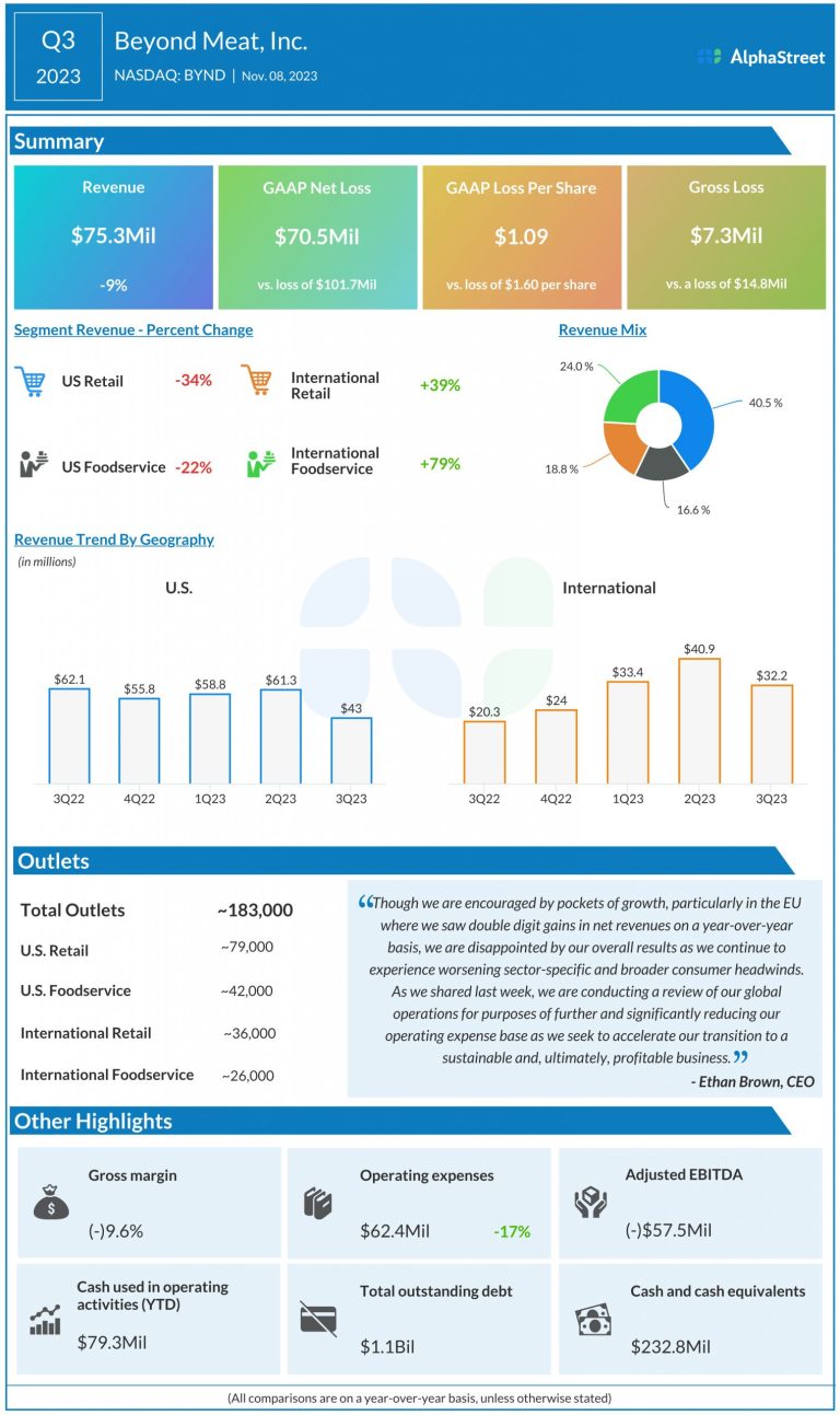 Beyond Meat, Inc. (NASDAQ: BYND) reported net revenues of $75.3 million for the third quarter of 2023, down...