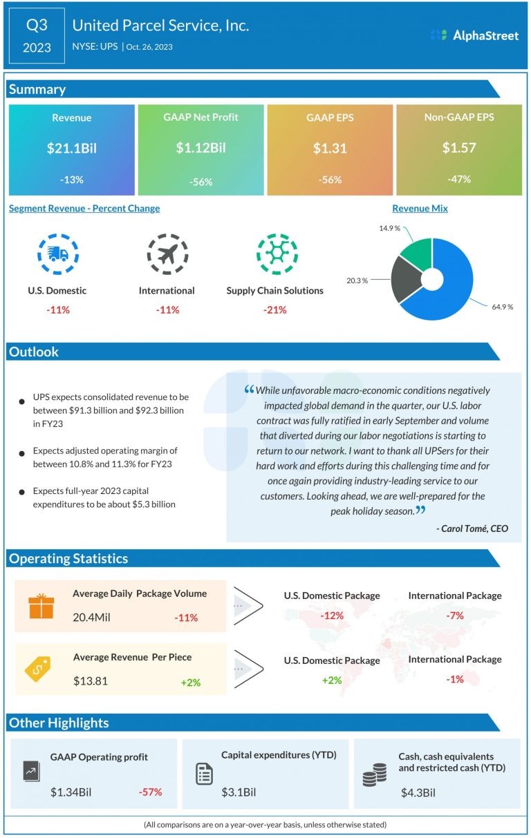 UPS (NYSE: UPS) reported third quarter 2023 earnings results today. Consolidated revenues decreased 12.8% year-over-year to $21.1 billion....