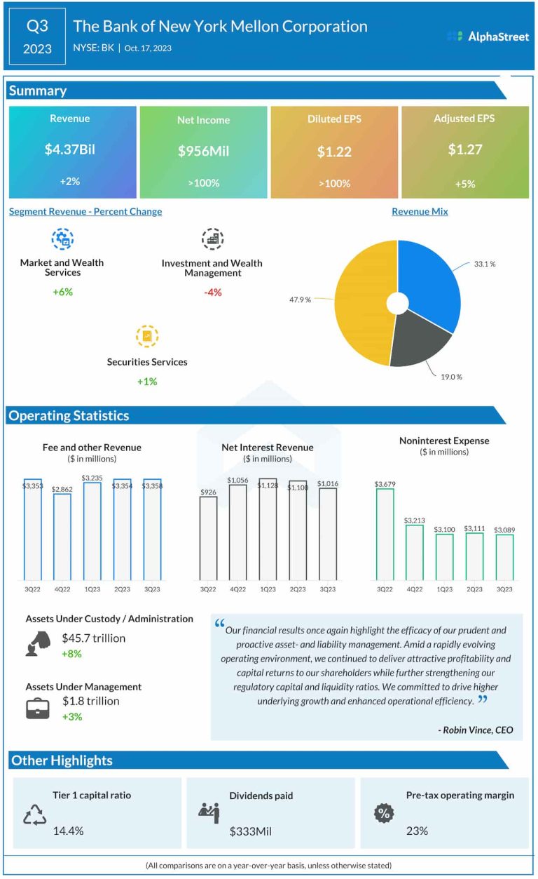 Financial services provider The Bank of New York Mellon Corporation (NYSE: BK) reported an increase in third-quarter 2023...