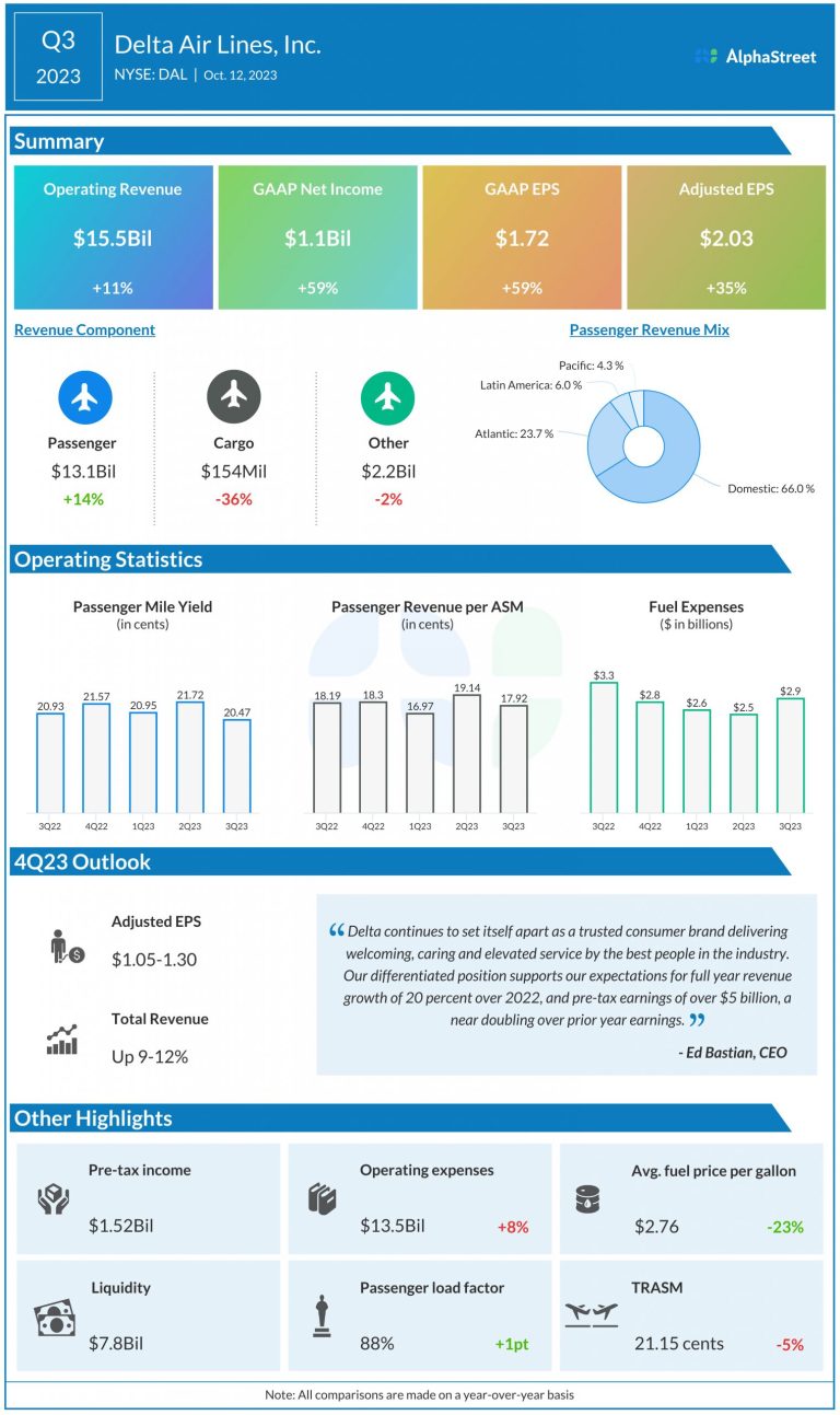 Delta Air Lines (NYSE: DAL) reported its third quarter 2023 earnings results today. Operating revenue increased 11% year-over-year...