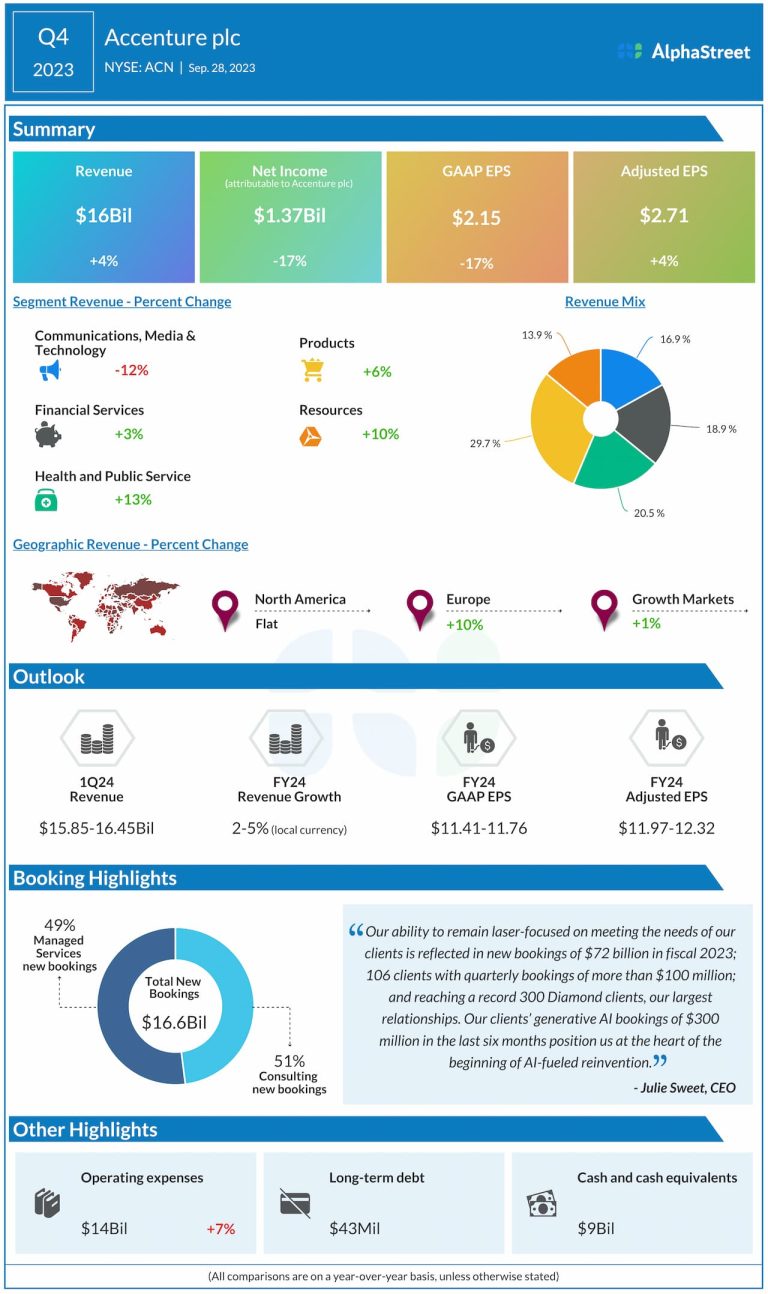 Accenture (NYSE: ACN) reported its fourth quarter 2023 earnings results today. Revenues were $16 billion, up 4% in...