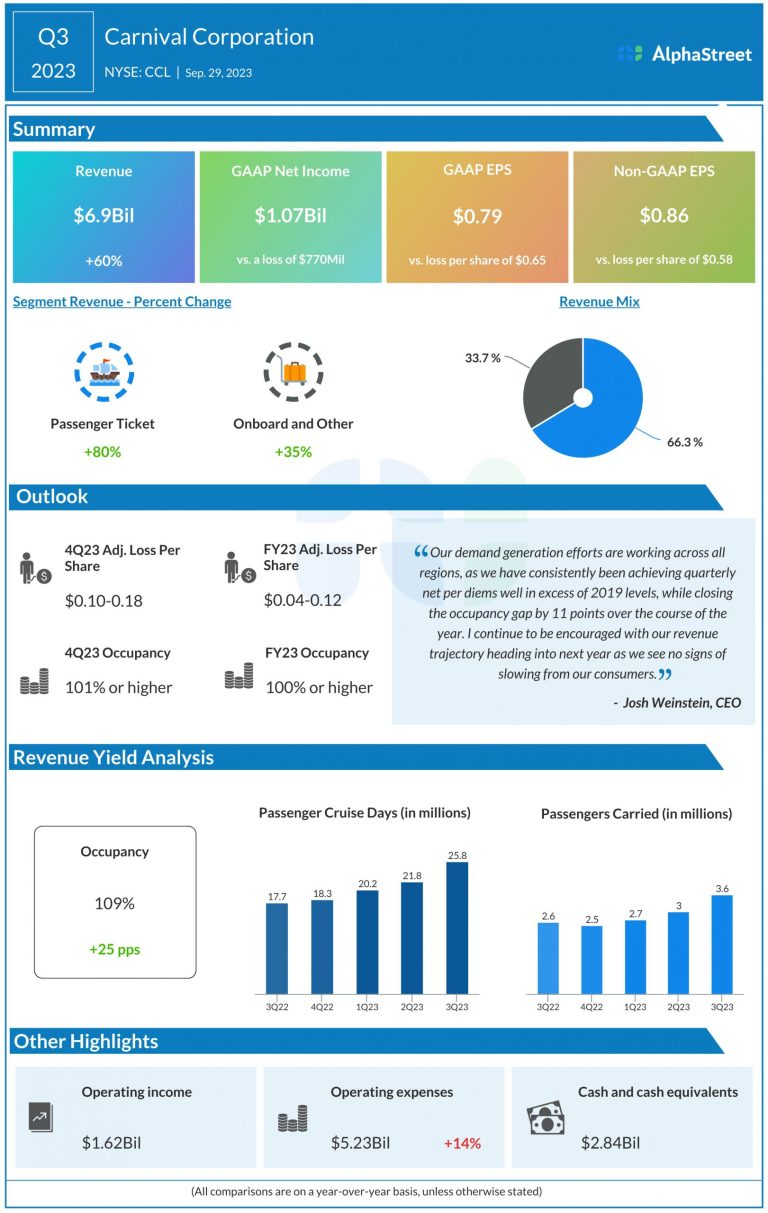 Carnival Corporation & plc (NYSE: CCL) reported third quarter 2023 earnings results today. Revenues were $6.9 billion compared to...