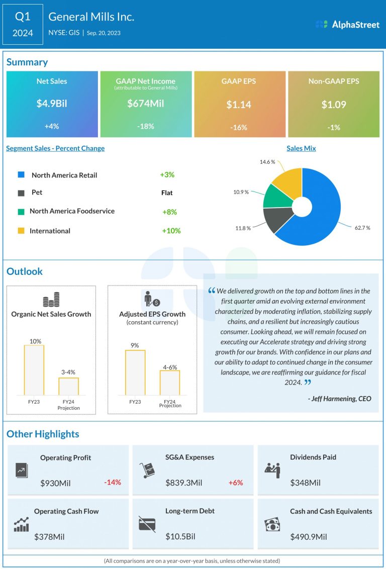 General Mills, Inc. (NYSE: GIS) reported first quarter 2024 earnings results today. Net sales increased 4% to $4.9...