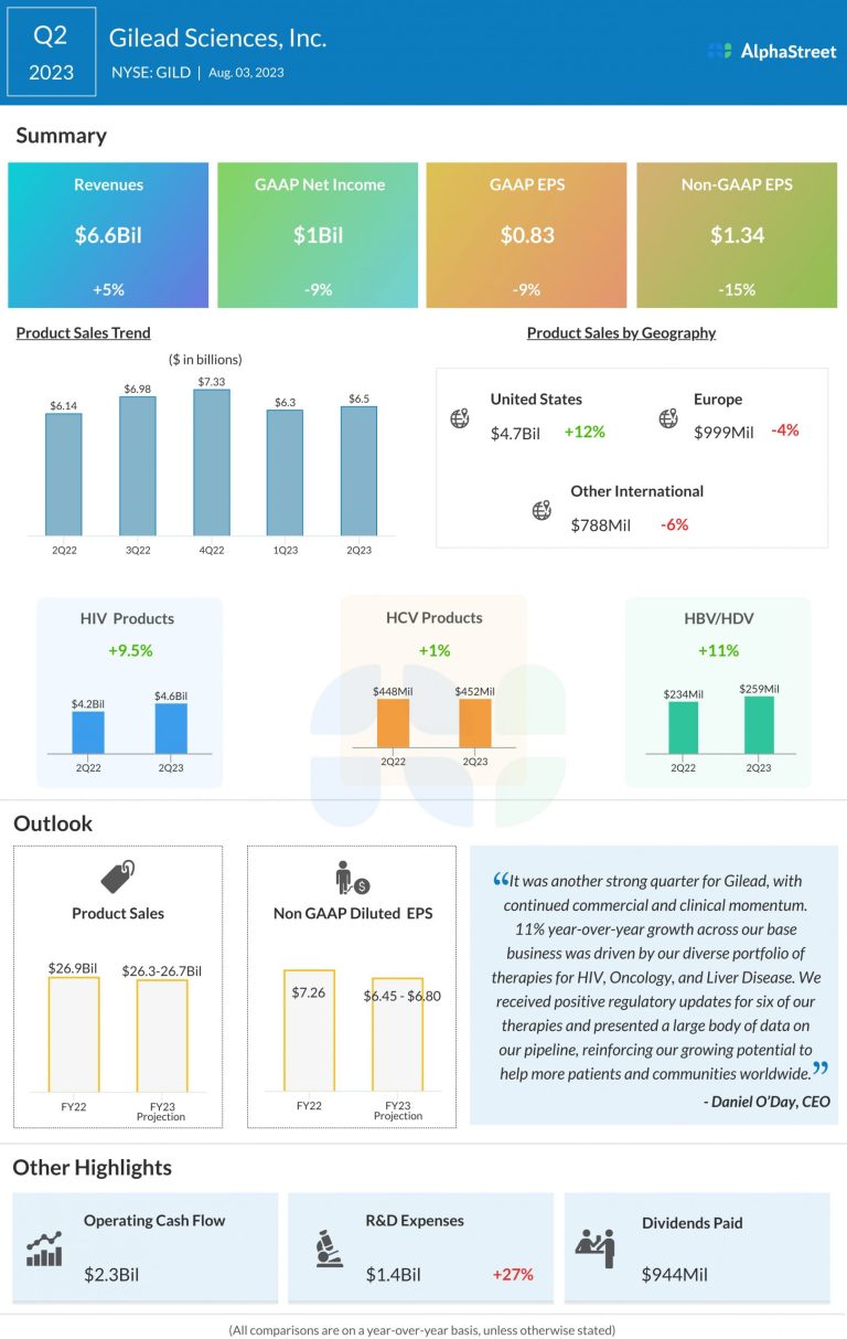 Gilead Sciences, Inc. (NASDAQ: GILD) reported total revenue of $6.6 billion for the second quarter of 2023, which...