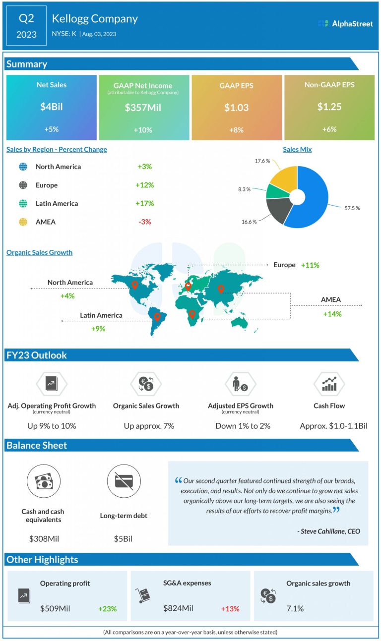 Kellogg Company (NYSE: K) reported second quarter 2023 earnings results today. Net sales increased 4.6% year-over-year to $4...