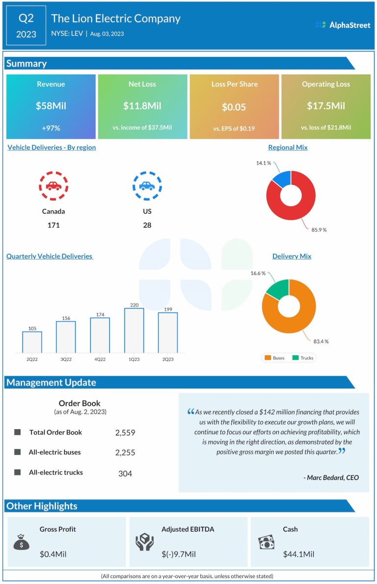 The Lion Electric Company (NYSE: LEV) reported second quarter 2023 earnings results today. Revenue rose to $58 million...