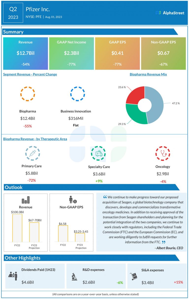 Pfizer Inc. (NYSE: PFE) reported second quarter 2023 earnings results today. Revenues decreased 54% year-over-year to $12.7 billion....