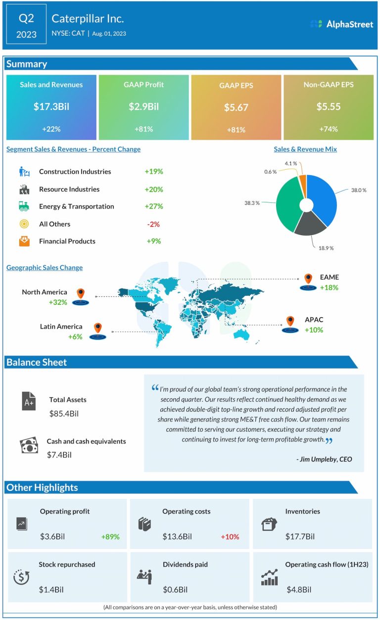 Caterpillar Inc. (NYSE: CAT) reported second quarter 2023 earnings results today. Total sales and revenues increased 22% year-over-year...