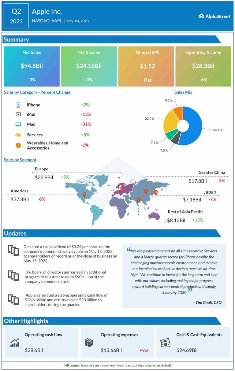 Gadget giant Apple Inc. (NASDAQ: AAPL) on Thursday said its second-quarter 2023 sales declined from last year, reflecting...