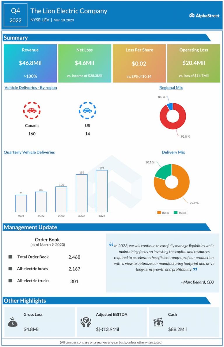 The Lion Electric Company (NYSE: LEV) reported revenue of $46.8 million for the fourth quarter of 2022 compared to...