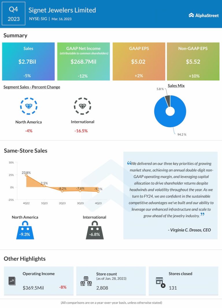 Signet Jewelers Limited (NYSE: SIG) reported fourth quarter 2023 earnings results today. Total sales decreased 5.2% year-over-year to...