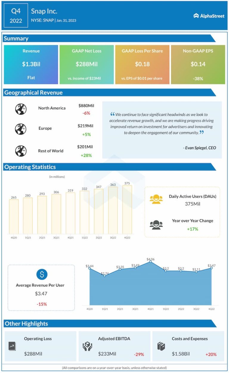 Snap Inc. (NYSE: SNAP) reported fourth quarter 2022 earnings results today. Revenue of $1.3 billion remained relatively unchanged...